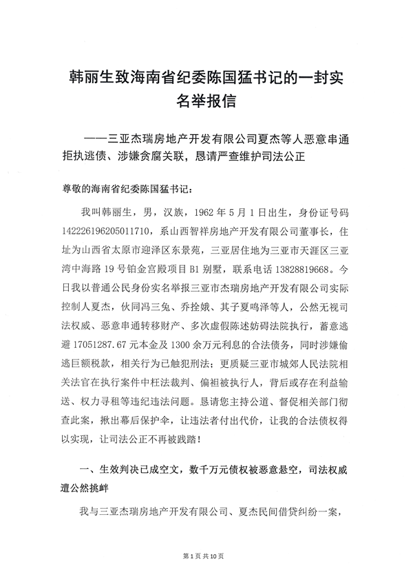 我叫韩丽生,系山西智祥房地产开发有限公司董事长,住址为山西省太原市迎泽区东景苑,三亚居住地为三亚市天涯区三亚湾中海路。今日我以普通公民身份实名举报三亚市杰瑞房地产开发有限公司实际控制人夏杰,伙同冯三兔、乔拴娥、其子夏鸣泽等人,公然无视司法权威、恶意串通转移财产、多次虚假陈述妨碍法院执行,蓄意逃避17051287.67元本金及1300余万元利息的合法债务,同时涉嫌偷逃巨额税款,相关行为已触犯刑法;更质疑三亚市城郊人民法院相关法官在执行案件中枉法裁判、偏袒被执行人,背后或存在利益输送、权力寻租等违纪违法问题。恳请您主持公道、督促相关部门彻查此案,揪出幕后保护伞,让违法者付出代价,让我的合法债权得以实现,让司法公正不再被践踏!